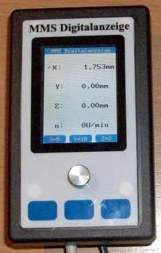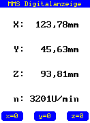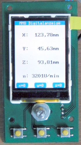 Allgemein Die Digitalanzeige basiert auf einem recht günstig bei Ebay zu bekommenden Handydisplay für das Siemens S65. Herzstück der Digitalanzeige ist ein PIC18LF4620. Dieser kümmert sich um die Abfrage der Sensoren und die Darstellung der Messwerte auf dem Display. Für die Bedienung sind einmal drei Funktionstasten vorgesehen, deren aktuelle Funktion unten im Display angezeigt wird. Hauptsächlich sollen Sie zum Nullen der Achsen dienen. Die Position des Nullpunktes von der aktuellen kann dabei frei eingestellt werden. Die Sensoren werden über einen RS485 Bus angesteuert. Zur Versorgung sind mit 12V Gleichspannung notwendig. |