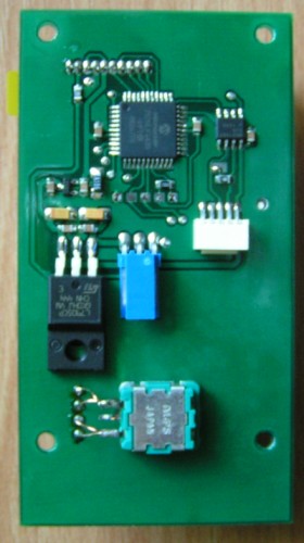 Auf der Oberseite der Platine sind das Display und die Taster montiert. Diese werden dann über Distanzscheiben durch die Folie hindurch bedient. Der Rotary Encoder wird von der Unterseite durch die Platine gesteckt und mit dieser verschraubt. Die Verkabelung sieht zwar nicht gerade professionell aus aber so spart man einiges an Bauhöhe. Der Großteil der Schaltung ist auf der Unterseite untergebracht. SMD Technik hat hier den großen Vorteil, dass das Display direkt darüber auf der Leiterplatte montiert werden kann. Beim Display werden einfach ein paar kurze Kupferdrahtstücke auf die Kontakte gelötet und dann durch die dafür vorgesehenen Bohrungen gesteckt.