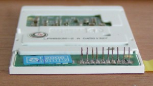 Als Gehäuse wird ein ABS-Etui-Gehäuse SP 2000 SW von Strapubox verwendet. Es hat die Außenmaße 102x61x26mm und ist recht günstig, z.B. bei Reichelt, erhältlich. Der Aufkleber ist spiegelverkehrt auf Tintenstrahlfolie gedruckt. Der weiße Hintergrund ist Teppichklebeband, das gleich zwei Funktionen erfüllt (Hintergrund und Klebeschicht). Tesa funktioniert hier am Besten. Bei dem im Bild oben habe ich Noppi verwendet, das ist etwas lichtdurchlässiger. Von daher sieht man auch die Löcher für die Platinenbefestigung durch (links und rechts über den Tasten). Entsprechende Distanzscheibchen über den Tasten sorgen dafür, dass diese durch die Folie hindurch bedient werden können. |