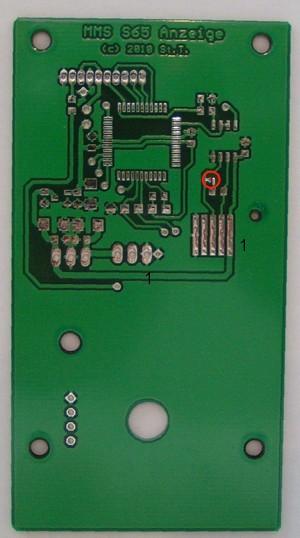 Der Jumper trennt die Anzeige von der Spannungsversorgung, für den Fall, dass der PIC neu programmiert werden soll und nur ein Programmiergerät mit 5V zur Verfügung steht. Rot eingekreist ist die Position der Lötbrücke für den RS485 Abschlusswiderstand. |
