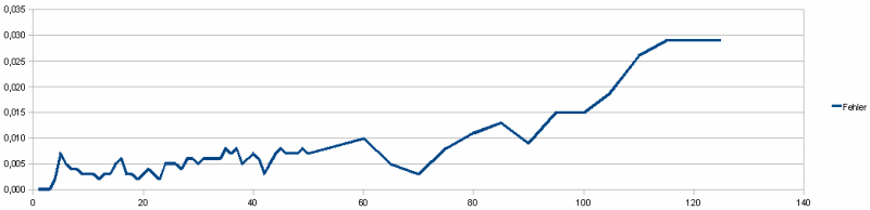 Die Abweichungen liegen im Bereich <80mm unter 10µm, was sehr gut aussieht. Die größeren Abweichungen im hinteren Teil sind wohl eher auf meinen etwas klapprigen ersten Versuchsaufbau zurückzuführen. Das verwendete Magnetband ist mit 40µm Genauigkeit spezifiziert. Selbst die größeren Abweichungen würden hier noch in der Spezifikation des Magnetbandes liegen. |