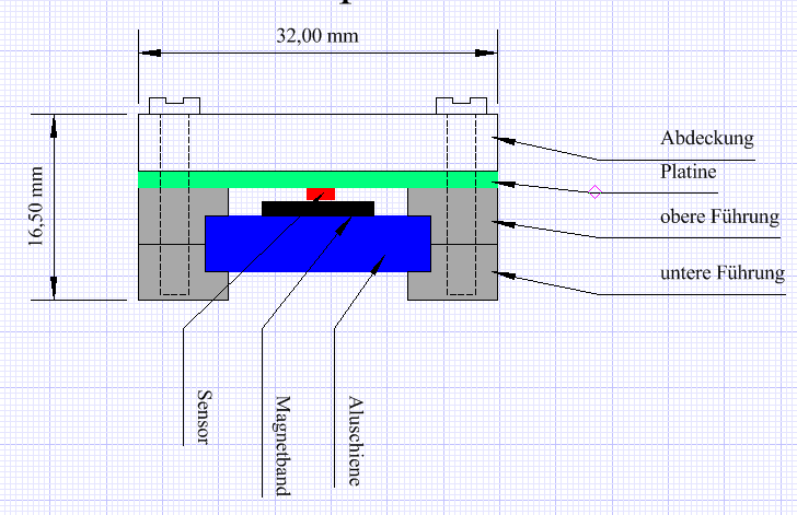 Die Bereichsangaben wurden mit einem Stück Testmagnetband der Firma Bogen Electronic experimentell ermittelt und decken sich auch mit den Angaben aus dem Datenblatt des AS5311. Da sich unter ungünstigen Umständen die Toleranzen der einzelnen Teile (Sensorschaltkreis, Magnetband, Abdeckband) summieren wurde folgender, recht einfach gehaltener Aufbau für eine Linearführung gewählt: