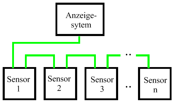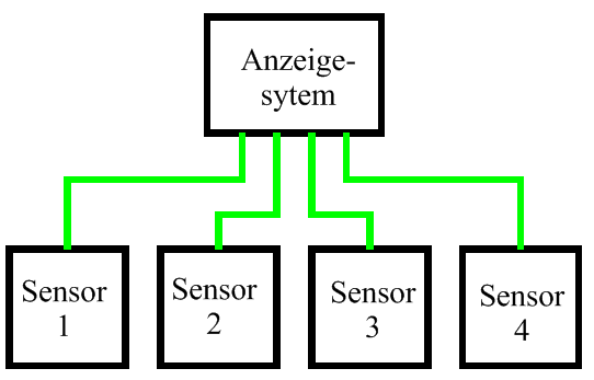 Allgemein Es gibt jede Menge von Anzeigesystemen und auch jede Menge Eigenbauprojekte zum Auslesen von Messschiebern, Magnetmesssystemen, Glasmassstäben etc., also warum das Rad noch mal neu erfinden? Hauptsächlich stört mich bei den ganzen Systemen, dass diese recht unflexibel in Bezug auf spätere Erweiterungen sind. Eine dreizeilige LED Anzeige kann nun mal nur durch eine weitere, zusätzliche erweitert werden. Von daher stand schon mal fest, dass nur ein grafikfähiges LCD Display für die Anzeige in Betracht kommt. Den Platz kann man flexibel einteilen und schnell per Software die anzuzeigenden Werte ändern. RS485 Bussystem Bei Systemen mit je einem Eingang für jeden Sensor sieht der Anschluss ungefähr so aus: