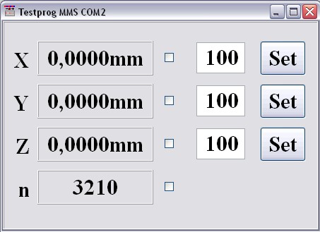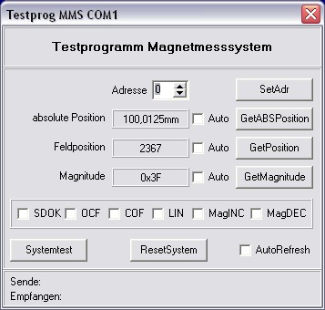 Damit können die Sensoren abgefragt und alle wichtigen Funktionen getestet werden. Zusätzlich kann mit diesem auch die Adresse eines Sensors gesetzt werden. Die verwendete Schnittstelle (COM1-COM4) und die Anzahl anzuzeigender Nachkommestellen werden in der mms.ini eingestellt.